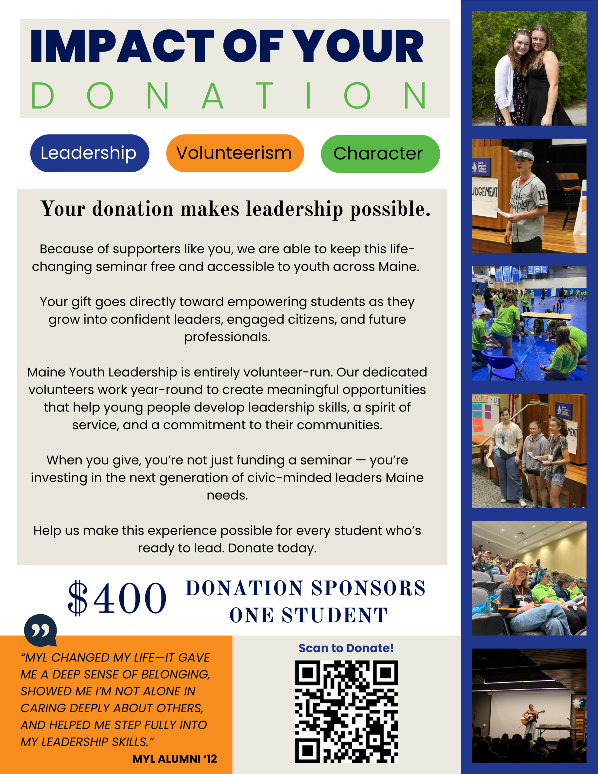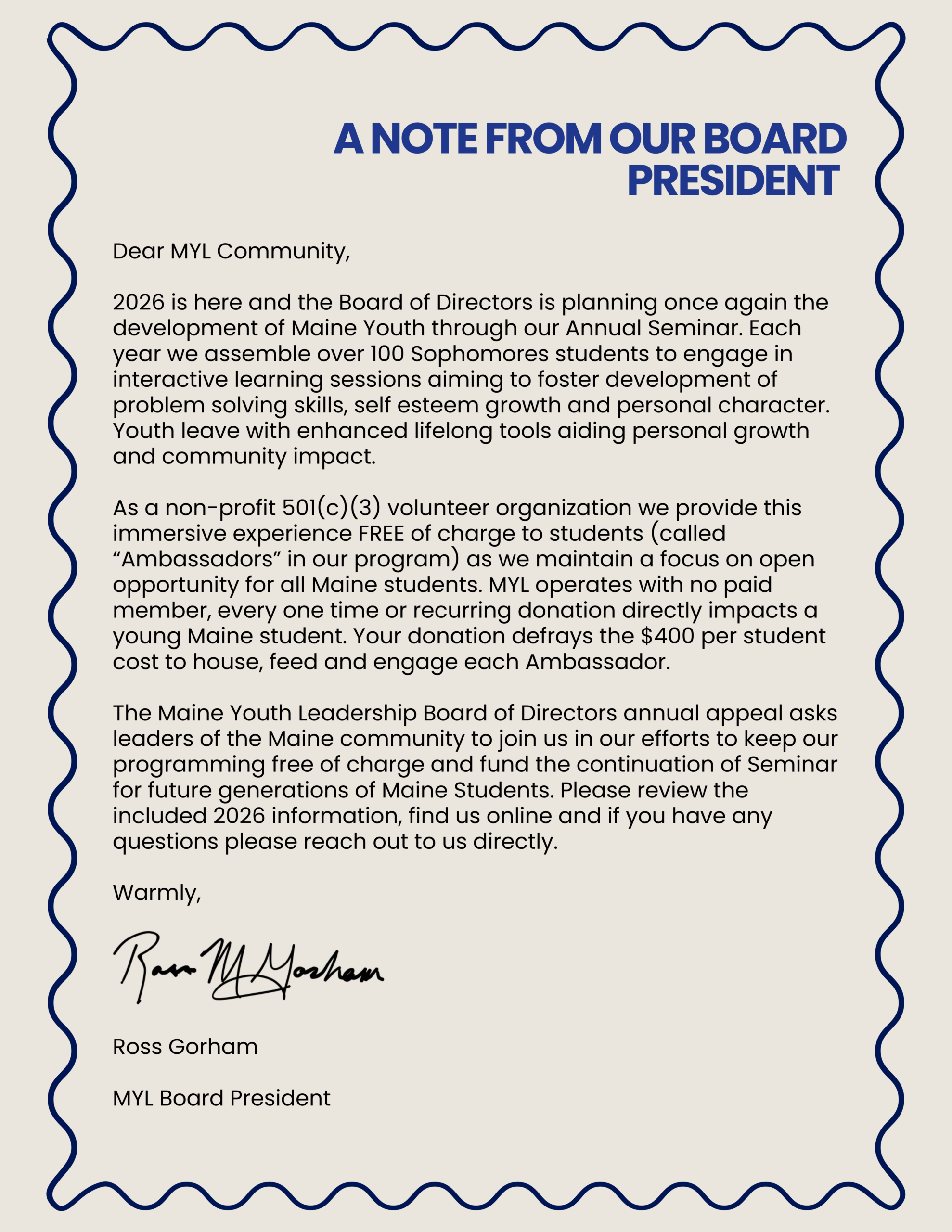 2026 Maine Youth Annual Appeal Facts About Maine Youth Leadership Impact of YOUR Donation Donate! A Letter from our President Get Involved & Upcoming Events